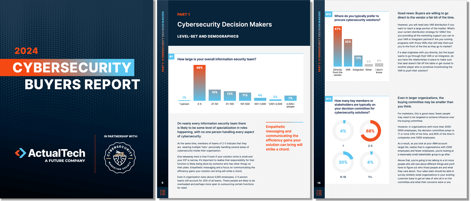Survey design, execution and report authorship. Over 300 cybersecurity buyers were surveyed to determine their drivers and pains, decision-making and vendor-selection criteria when procuring cybersecurity solutions. Report results were featured live at CyberMarketingCon 2023 in Austin, Texas.
